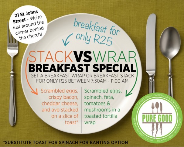 Stack VS Wrap for just R25 every day between 7:30-11am. They also cater for the carb conscious and you can swop your toast out for spinach for a banting option! I’ll definitely be trying this out sometime soon, and to be honest will probably be a regular there in the morning with this offer on the table. You can check them out on Facebook or Twitter for more about their spot, dinner club or to join their weekly menu mailer! As my good friend Jonathan Woolley would say: “this place is PURE!”