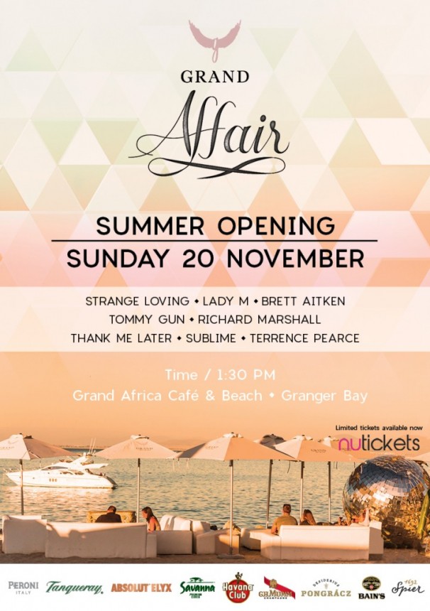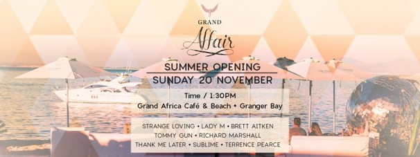 Following the glamorous revamp at Grand Africa Café & Beach we would like to introduce GRAND AFFAIR, the very first Summer Opening Party, taking place at Grand Africa Cafe & Beach on Sunday 20 November 2016! We have a great line up ready for you starting at 13:30: