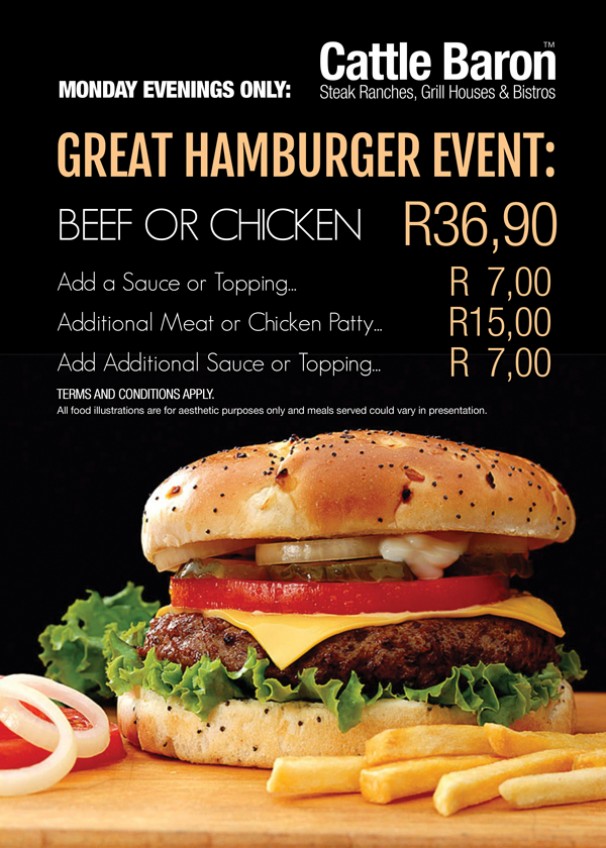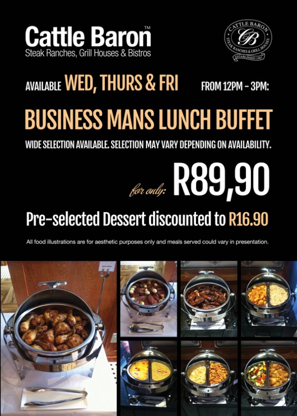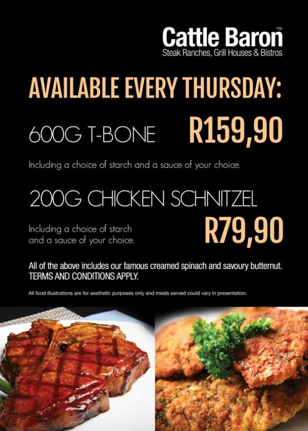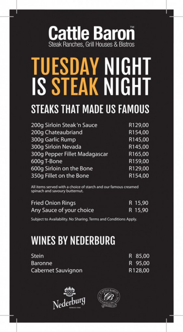 Capetonians love a good restaurant special. In this case, let’s call it a half dozen specials as Cattle Baron in Chiappini Street, Cape Town kicks off with some meaty madness. I’m sure the festive season also took it’s toll on your wallets, so head down to the new Baron for any of these killer deals. I’m most looking forward to trying out the Business Mans Lunch Buffet and the 600g ribs special. But if you’re a meat eater, there’s a special every day of the week awaiting your taste buds!