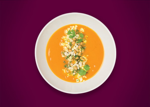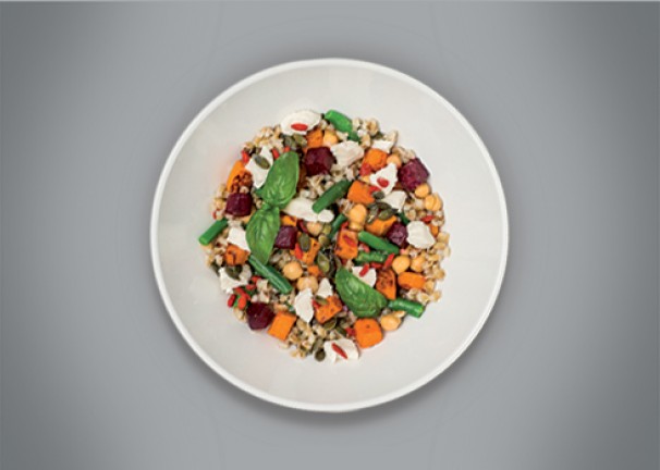 Chickpeas, barley, butternut, green beans, beetroot, basil, pumpkin seeds, goji berries, goat’s cheese served with a coconut and honey dressing.