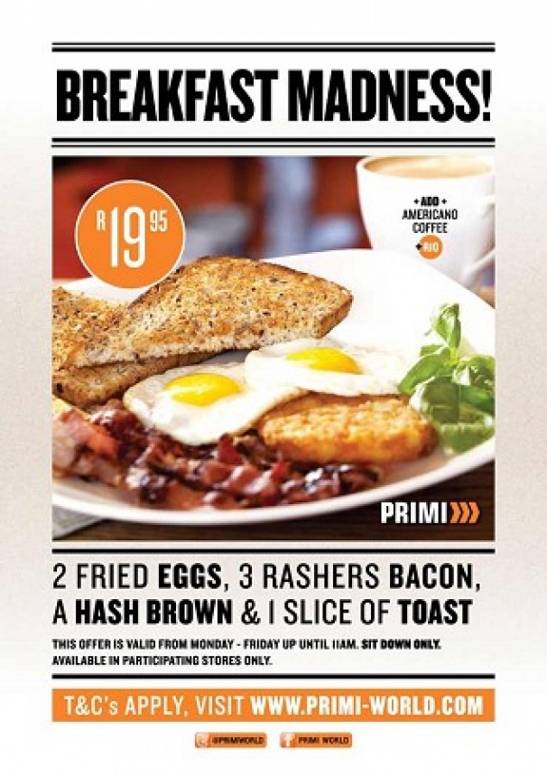 Primi Piatti have launched a sick new breakfast special recently and I thought it was worth sharing with you. Breakfast Madness: 2 fried eggs, 3 rashes of bacon, a hash brown and 1 slice of toast for a killer R19.95 from Monday – Friday until 11am. Sit down only. Follow @PrimiWorld on Twitter to enquire about anything or just keep up with their day to day specials and their awesome new loyalty program!