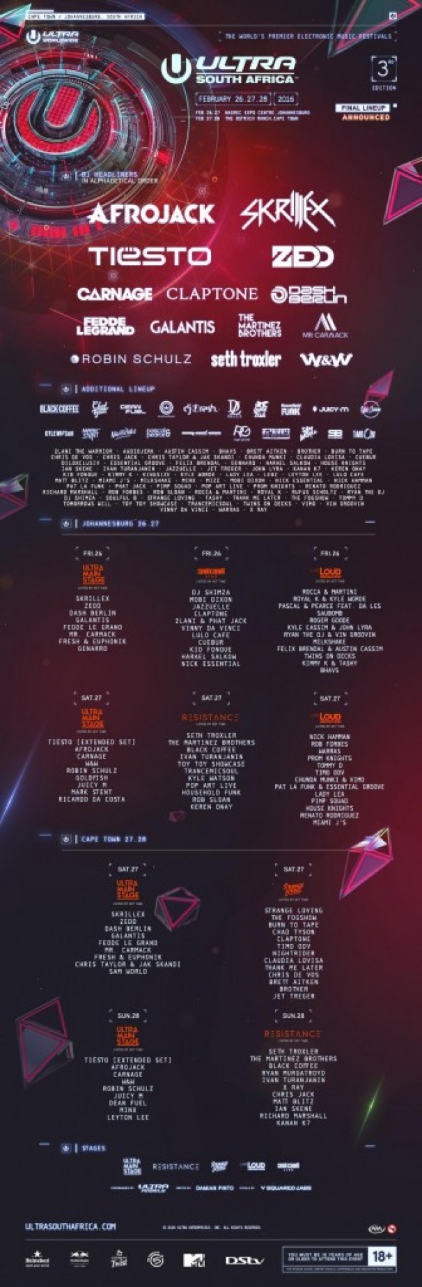 The Johannesburg edition of ULTRA South Africa™ will feature three stages across Friday, February 26th and Saturday, February 27th. In addition to the gargantuanMain Stage, there will be a Soul Candi Live Stage on Friday 26th, which will transform into the RESISTANCE® Stage on Saturday 27th. Johannesburg’s third stage arrives in the form of the 5FM Live Loud Stage, which will play host to the station’s best DJs and South Africa’s best club acts across both days. For full details, see below.
