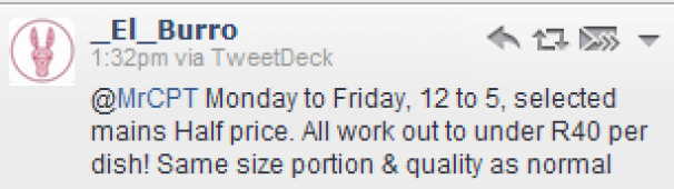 I am actually yet to try this popular joint out, but I only ever hear good things about it. They are very active on Twitter and it bring them countless booking everyday that I see running through my timeline. Every restaurant in Cape Town can learn a thing or two about how to use social media to not only create brand awareness, but also drive traffic to your place!