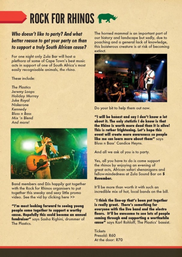 So, Rock For Rhino’s is basically an event that bring together some of our top local artists for one night only at the new Zulu sound bar. After costs everything will go to helping save our famous African rhino’s, who are in danger of becoming extinct if nothing is done about the poachers that feel the need to kill them and steal their ivory horns.