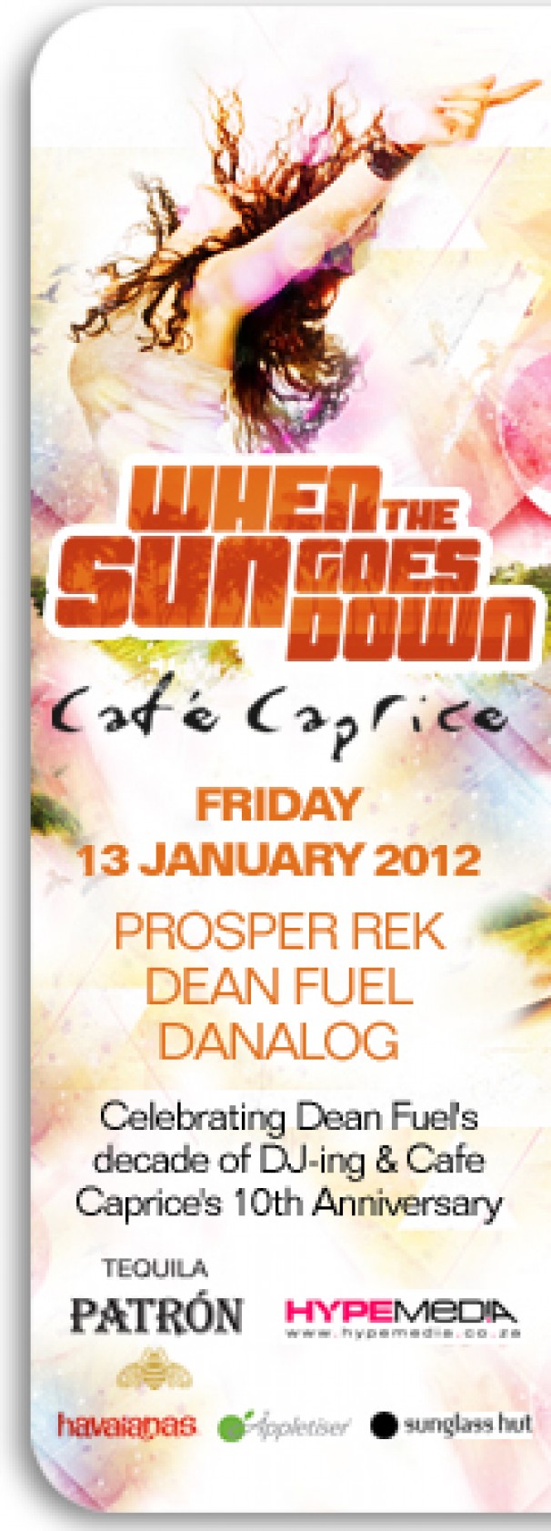 Looking for a sick place to go for some pre drinks this Friday? Look no further: When The Sun Goes Down brought to you by Hype Media & Patron at none other than Café Caprice! The event is based around the fact that it’s Café Caprice’s 10th anniversary, and, it also happens to be Dean Fuel’s decade behind the decks!