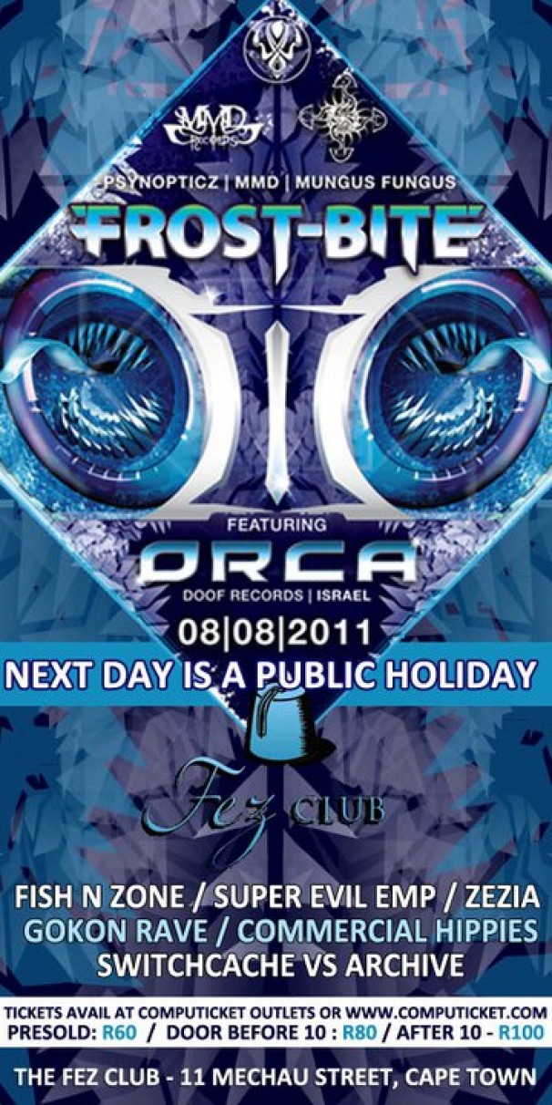 The FEZ – Cape Town. This year, Frost-Bite II will be hosted at one of Cape Town’s most well-known venues, The Fez! The venue boasts multiple areas. outdoor smoking and chill area, multiple bars, balconies and offers a massive fully air conditioned dancefloor. The venue will be transformed into a psychedelic winter spectacle by Mungus Fungus and PsynOpticz Design, and showcase warping visuals being provided by Image Master Blink.