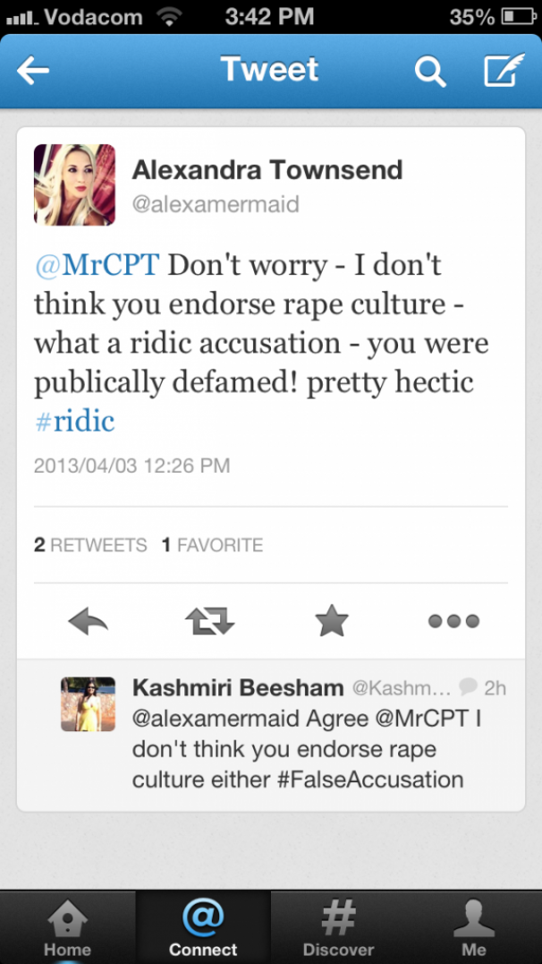 That’s my clearing the Twitter waves and giving you an explanation of how a tweet which was worded and perceived wrong, can be used to stir up stories about one’s individual beliefs… It seems it’s not the first Twitter war this Editor Lili has had, which kind of raises an eyebrow for me! I am not here to attack people personally, you can get the just of her professional conduct in this blog post I found (http://j8kes.com/post/47015993357/mrcpt-liliradloff-and-women24-corporate-social)