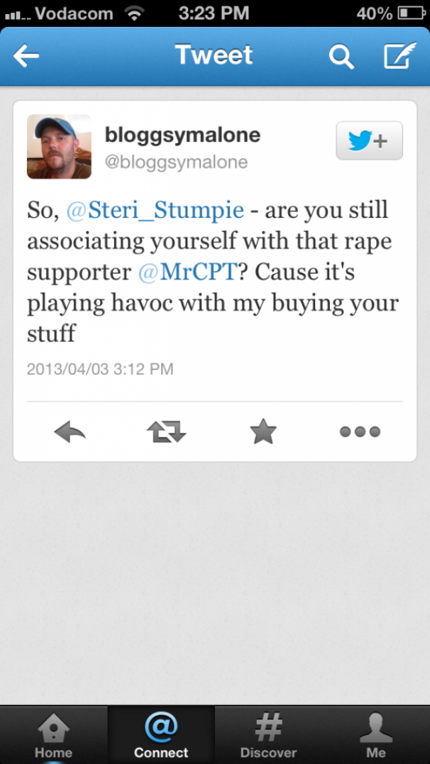 My tweet has been used by these tweeters/bloggers (and their online corporate identities) and turned into a manufactured piece of nonsense which has caused unnecessary and widespread outrage as well as defamatory action.