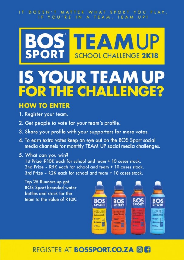 BOS Sport announces its TEAM UP School Challenge 2K18! It doesn’t matter what sport you play. If you’re in a school team, it’s time to TEAM UP with BOS Sport. The sports drink powered by rooibos is challenging school sports teams to TEAM UP and stand the chance of winning their share of R50K in prizes for their team and school.