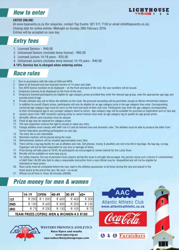There will also be a lucky draw after the race, so stick around for prize giving. There’s a 32 inch Samsung LCD TV up for grabs, plus prize money for podium finishers as you can see broken down above. Online entries close at midnight on 28 February, but you’re still able to enter on race day. For enquiries contact Top Events on 021-511 7130 or email info@topevents.co.za!