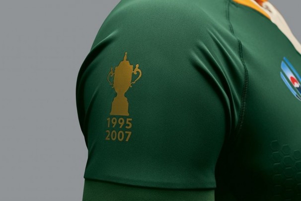 The Springboks’ home jersey has a more traditional olive green and orange gold look that draws inspiration from the 1995 Rugby World Cup winning team.