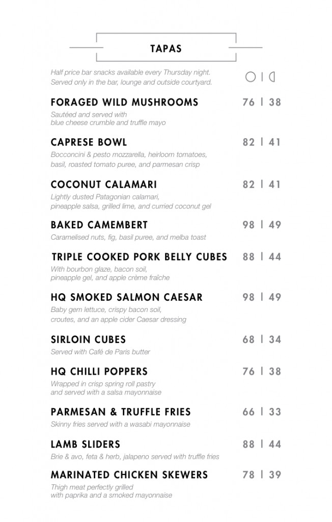 Remember that every Thursday is tapas night at HQ, which means half price tapas! You can see the Thursday night prices on the right column of the menu, but make sure you book as it gets packed with a vibe.