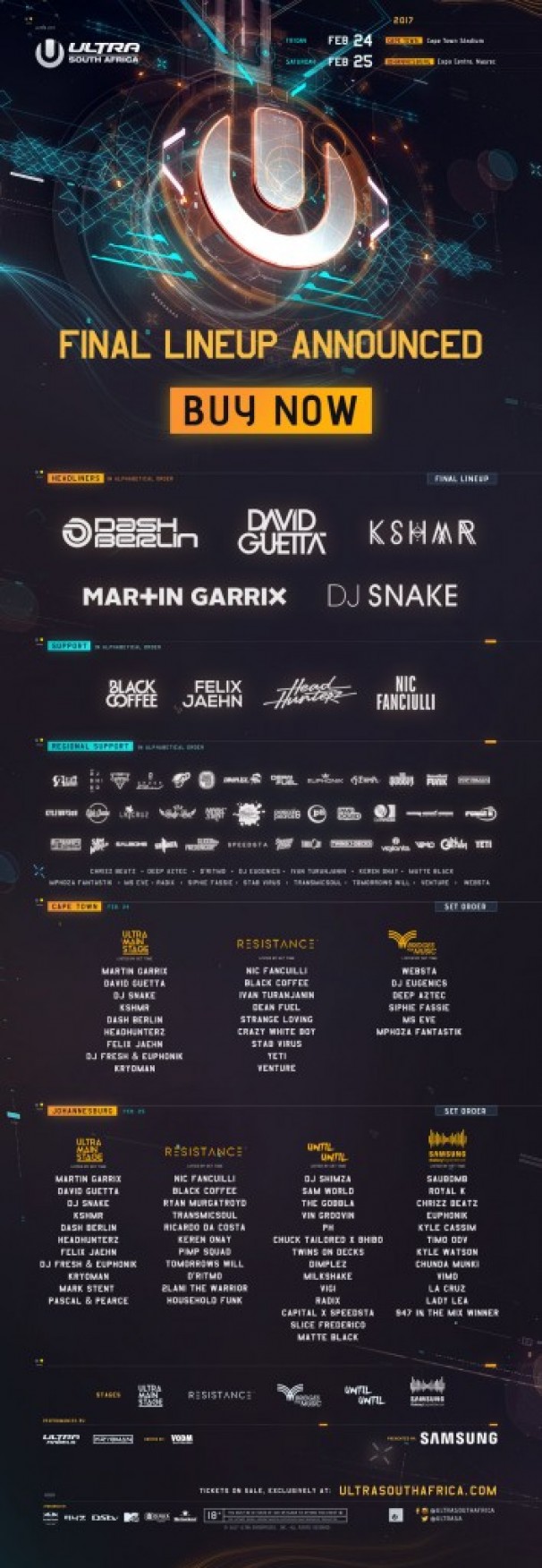 ULTRANAUTS! Your full lineup and stages for the 2017 festival in Cape Town and Johannesburg have been announced. For the Cape Town show Phase 2 tickets have just opened for sale, and there are limited General and VIP tickets available, which you can purchase on NuTickets [here]. To mark the countdown the release of Phase 2 tickets being released for the Cape Town show, I will be giving away another two sets of double tickets, but this time just for the Mother City! You can see the full lineup below and get any information you need on the Ultra South Africa website: www.ultrasouthafrica.com. Keep reading after the jump to see how you can WIN tickets!